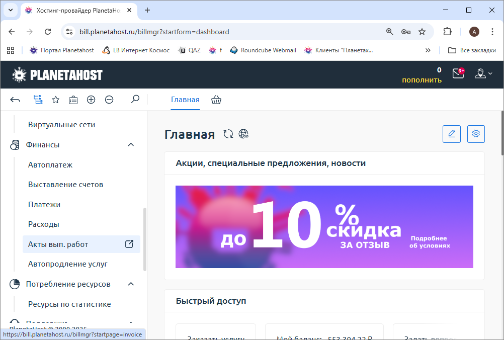2. После входа в систему откройте меню слева, найдите раздел «Финансы» и выберите пункт «Акты выполненных работ».