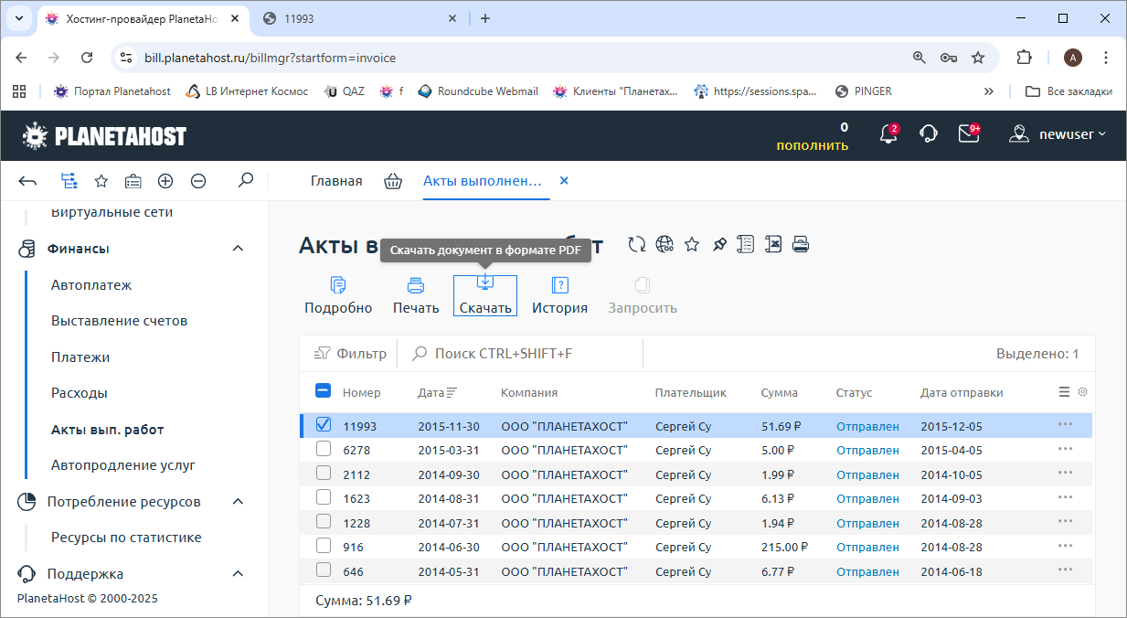 3. Перед вами откроется список актов выполненных работ за каждый месяц. Выберите нужный период и нажмите кнопку «Скачать» в верхней части страницы.