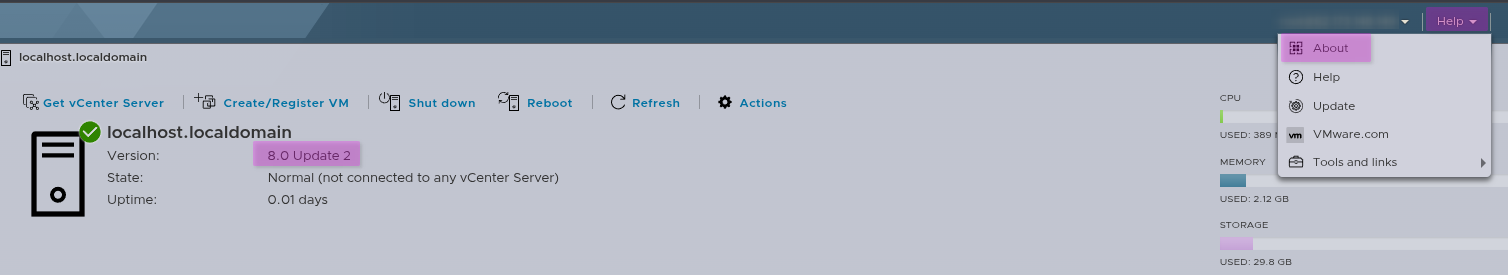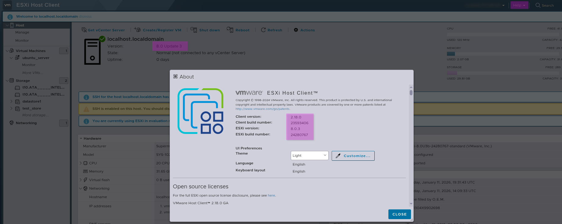 • Из веб-интерфейса: Информация отображается на главной странице vSphere/ESXi Host Client.