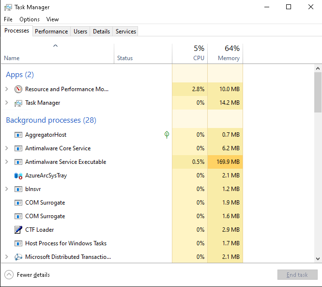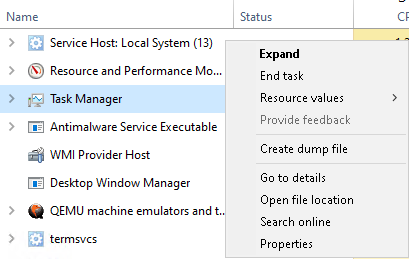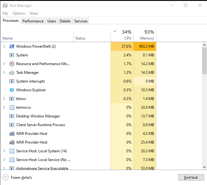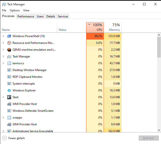 - Проверить, является ли процесс критическим для работы сервера. Если нет, то можно остановить его щёлкнув правой кнопкой мыши по процессу и нажать "Завершить процесс" (End task).