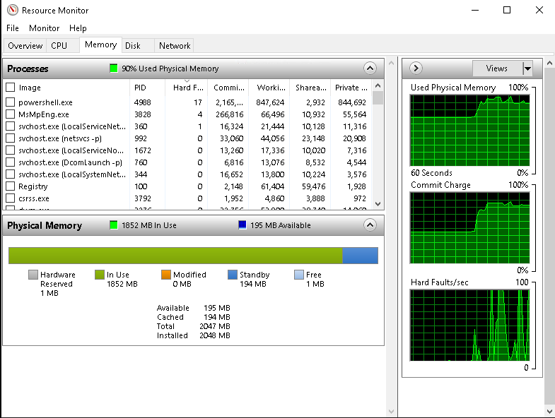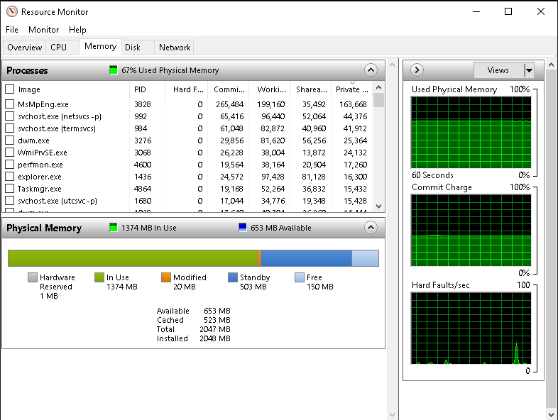 - Диагностика: в Resource Monitor — раздел «Память» (Memory), обратить внимание на «Ошибок страниц/сек (Hard Faults/sec)».