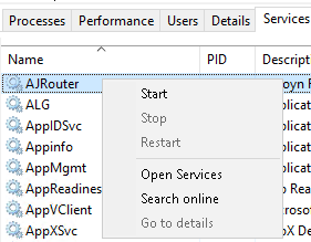 - Попробовать перезапустить службу (Service) или приложение. Во вкладке "Службы" (Service) нажать "Стоп", а затем "Старт" или просто "Рестарт".