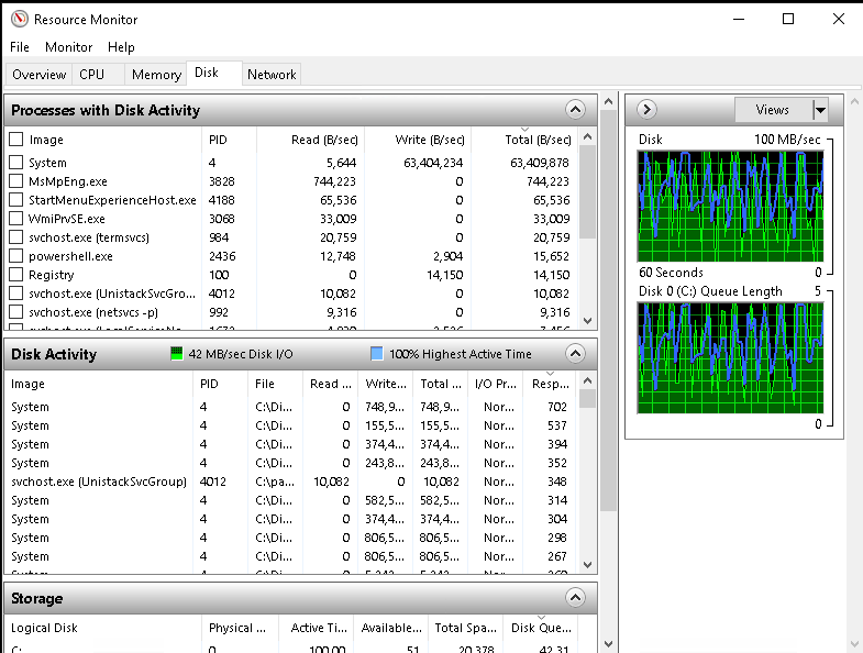 - Признаки: 100% активность диска (Disk Active Time) в диспетчере задач, медленная работа при чтении/записи.
