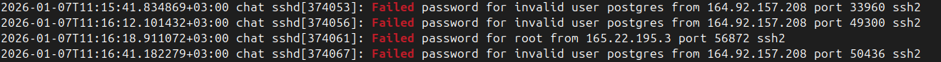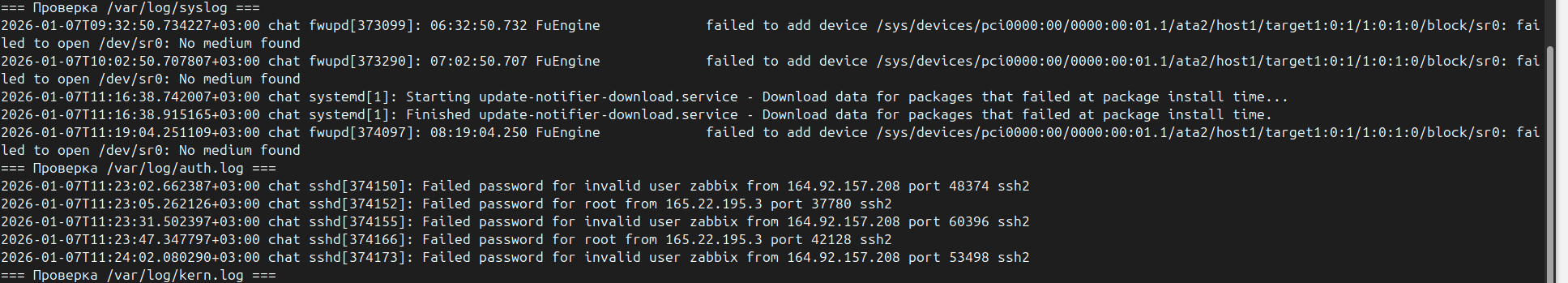 | Неудачные попытки входа | Медленная работа SSH, подозрительная активность | /var/log/auth.log, /var/log/secure | Failed password for, много попыток с разных IP, несуществующие имена пользователей |