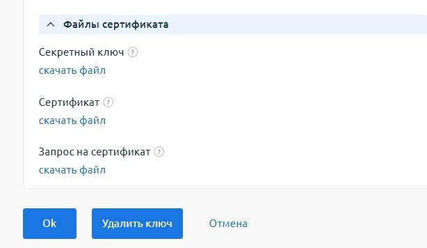 Далее сверху нажать кнопку Просмотр и опуститься в самый низ. Тут Вам надо скачать сам сертификат и секретный ключ.