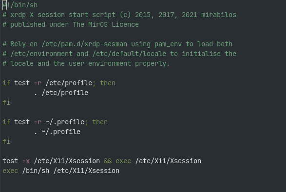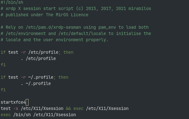 sudo nano /etc/xrdp/startwm.sh - Найдите в файле строки, которые запускают startxfce4 или другие оконные менеджеры. Если их нет, перед последней строкой test -x /etc/X11/Xsession && exec /etc/X11/Xsession добавьте строку для запуска вашего DE. Например, для Xfce: