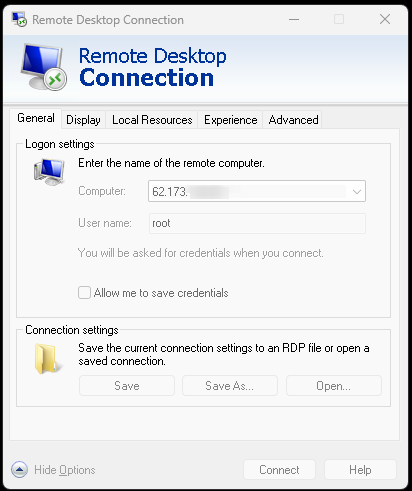 Windows: Откройте приложение "Подключение к удаленному рабочему столу" (mstsc.exe). Нажмите Win + R, введите mstsc и нажмите Enter.
