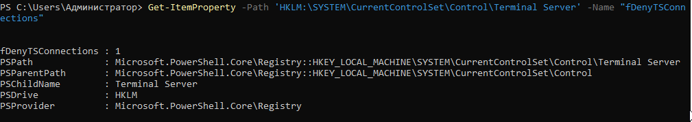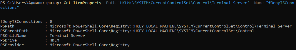 Get-ItemProperty -Path 'HKLM:\SYSTEM\CurrentControlSet\Control\Terminal Server' -Name "fDenyTSConnections"