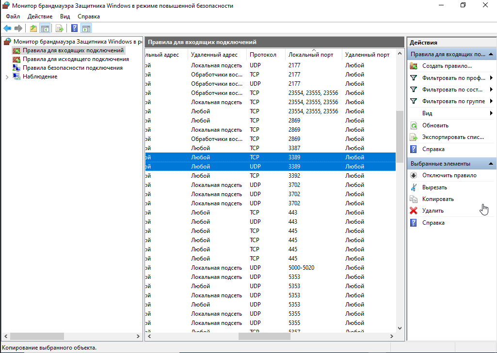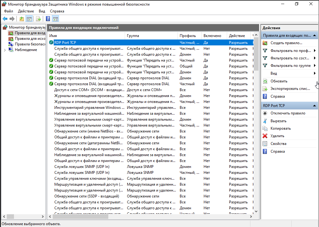 - Проверьте Правила для входящих подключений, можно отсортировать правила колонке Локальный порт и найти порт 3389 (стандартный порт для RDP).