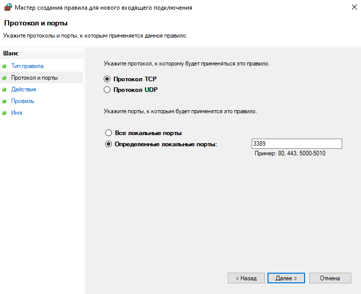 - Протокол и порты: Оставьте протокол TCP. Выберите «Определенные локальные порты» и укажите порт RDP (по умолчанию 3389). Если вы меняли порт, укажите свой.