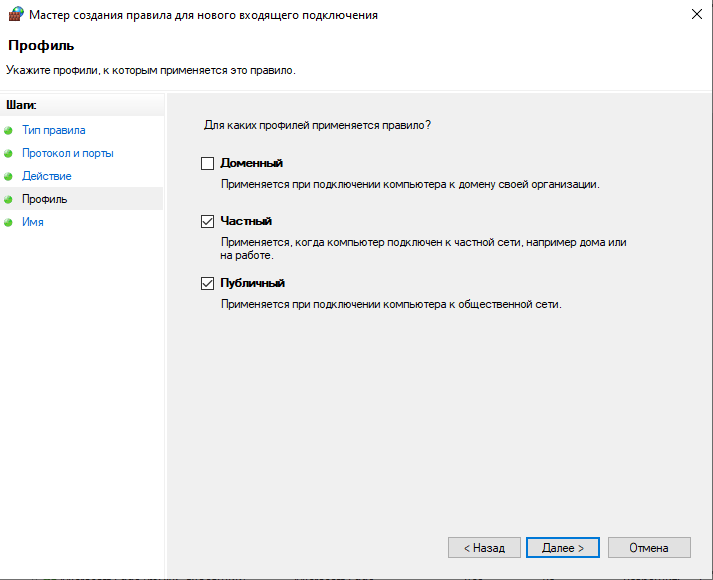- Профиль: Оставьте галочки для тех профилей (Доменный, Частный, Публичный), в которых должен работать RDP. Для сервера достаточно «Частного» и «Публичного».