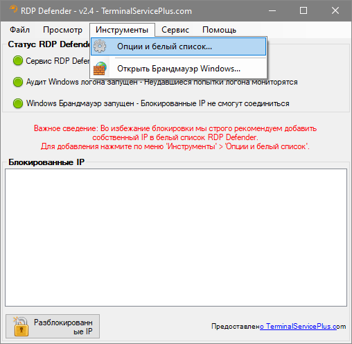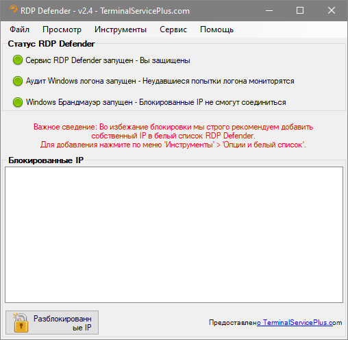 После запуска программы можно сразу оценить работу. На стартовом кране видно статус работы всех сервисов и список последних заблокированных IP.