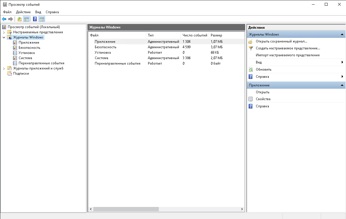 После открытия оснастки полезная информация в основном сосредоточена в узле «Журналы Windows», который включает несколько ключевых подразделов.