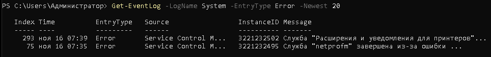 Get-EventLog -LogName System -EntryType Error -Newest 20