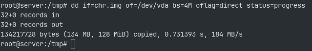 dd if=chr.img of=/dev/vda bs=4M oflag=direct status=progress