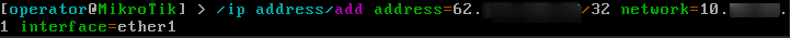 /ip address add address=62.173.XXX.XX/32 network=10.X.X.1 interface=ether1