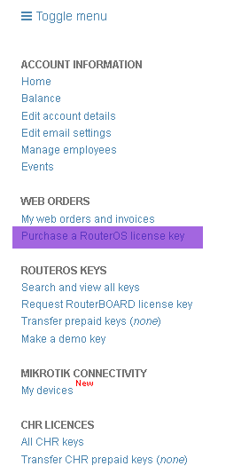- Приобретите ключ лицензии через раздел "Purchase a RouterOS License Key".